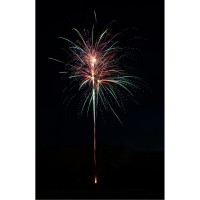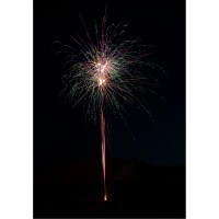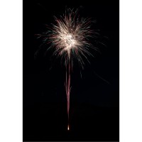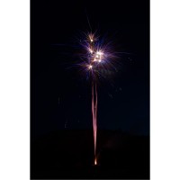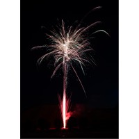 Verbundfeuerwerk mit 4 Batterien und 144 Schuss; Bunte Effektaufstiege mit extremer Zerlegung zu drehenden Chrysanthemen-, Leuchtstern-, Trauerweiden-, Glitzerregen- oder knisternden Palmenblüten-Buketts, endend in einem schnell geschossenen Finale aus 6 Salven mit je 6 Titan-Salut-Effekten.
