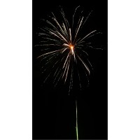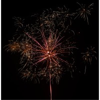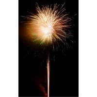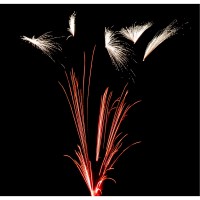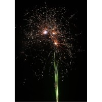 Phase 4: 72 Schuss in schneller Abfolge aufsteigende Effektbuketts mit bunten Sternen und Glitzereffekten oder goldenen Brokatsternen, gefolgt von einem mächtigen Finale aus silbernem Crackling-Regen.
